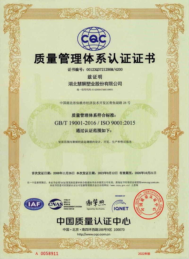 湖北慧獅塑業(yè)股份有限公司是一家專業(yè)從事研發(fā)、生產(chǎn)、銷售高性能聚烯烴流延薄膜的高新技術企業(yè)。
